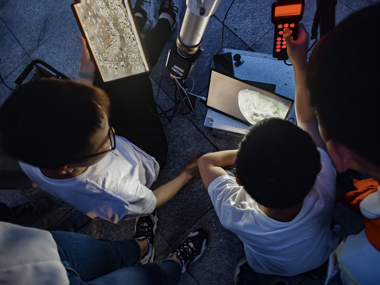 与月亮的亲临对视,触动着一颗颗探索宇宙未知的心灵。小朋友们围坐在一起,跟着图谱天文技术老师观测辨认月面的奇妙地貌。