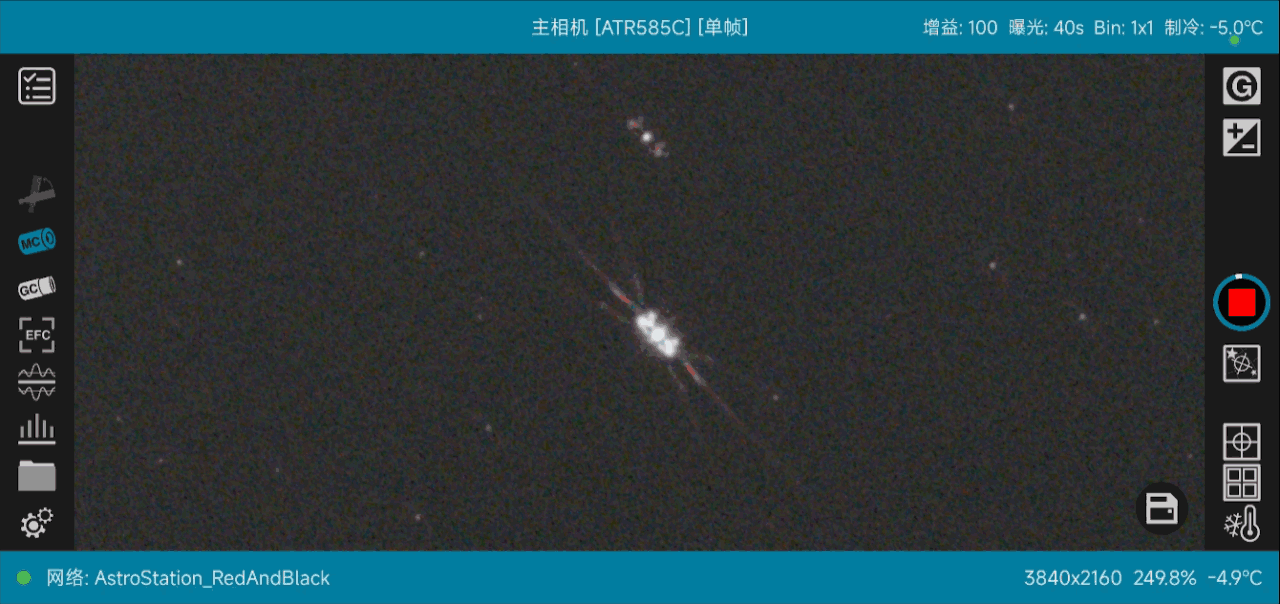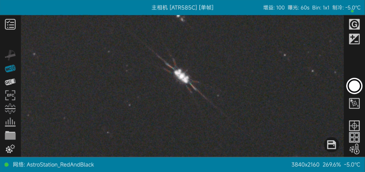 1. 初步对焦:相机连接到望远镜,进行粗略对焦,并对准画面中的亮星。