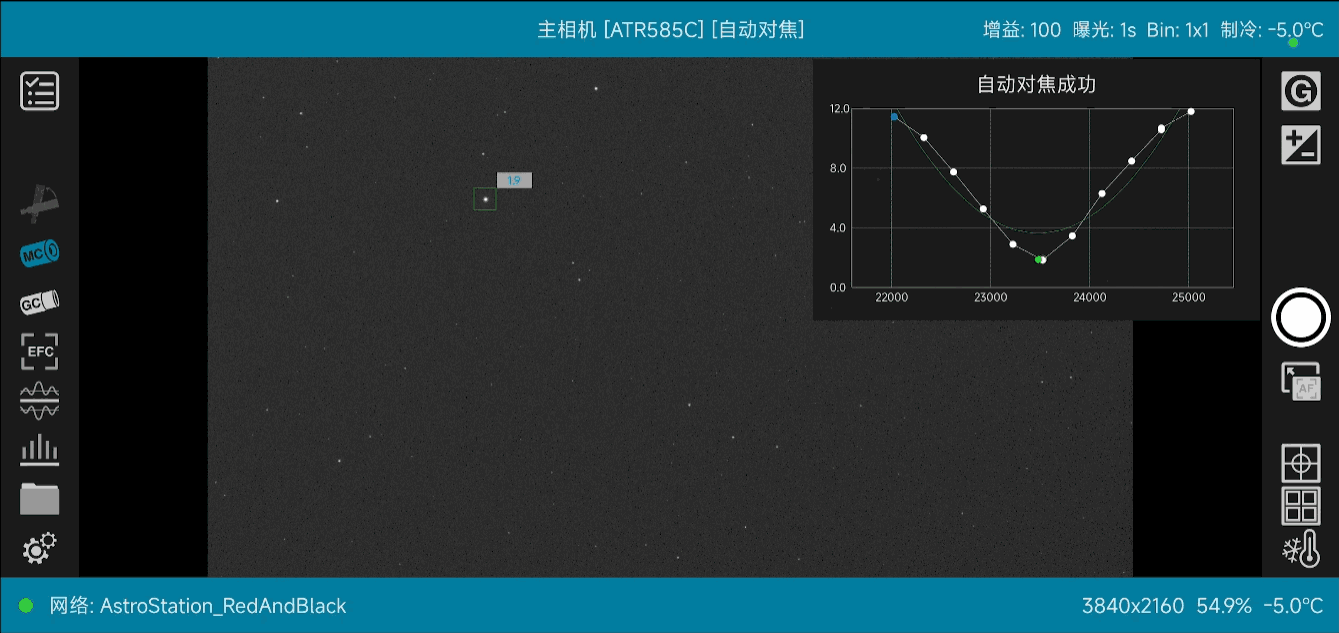 天文智能控制器能够良好兼容墨空电调焦,对焦配合默契。三次连续自动对焦均顺利完成,拟合曲线趋势流畅,其间可见星点锐利,说明天文智能控制器对焦稳定准确。