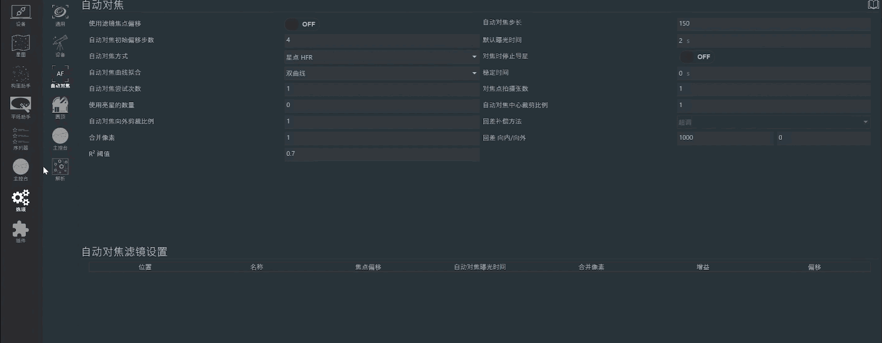 由于此次测试的望远镜调焦座具有较大空程,电调回差初始设置为1000,对焦步长为150,曝光时间为2s,具体的参数设置可以按照个人设备的实际情况调整。