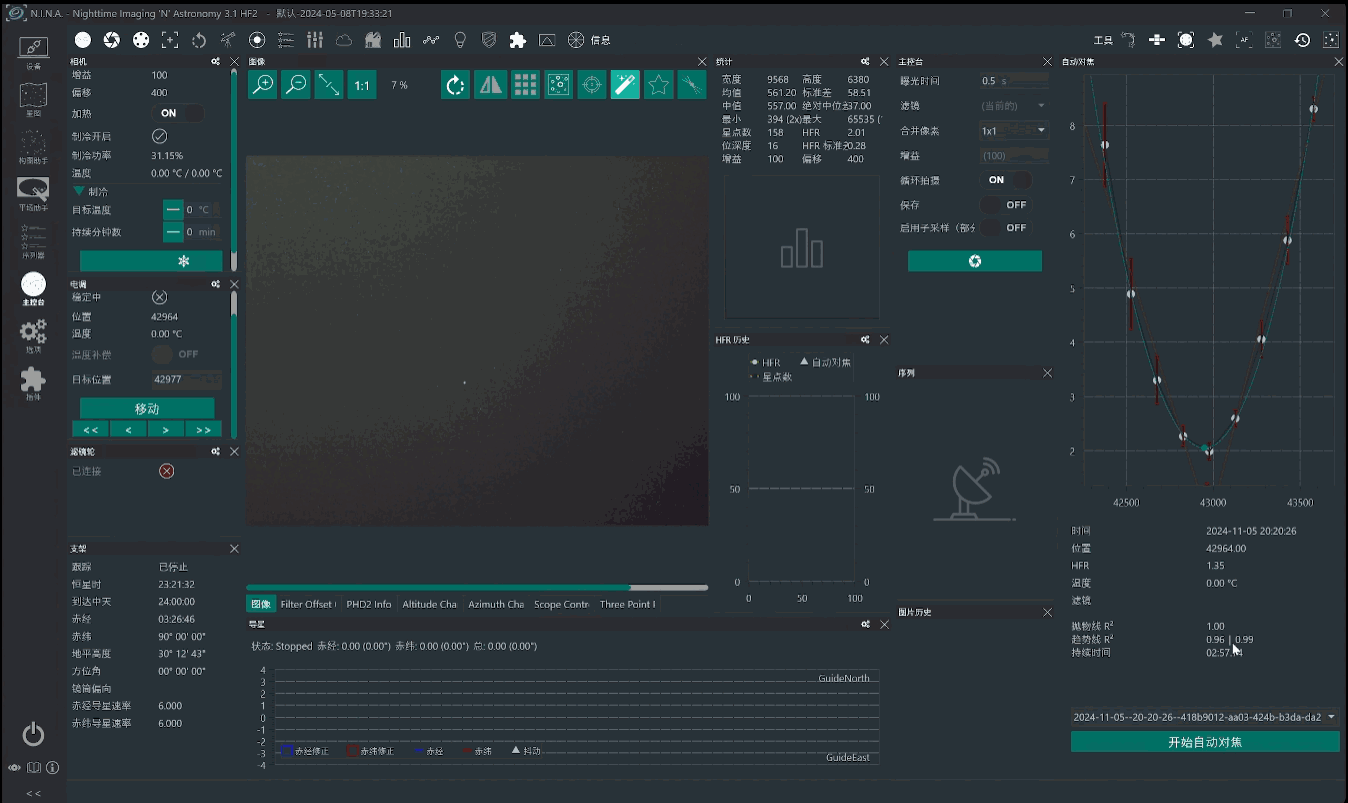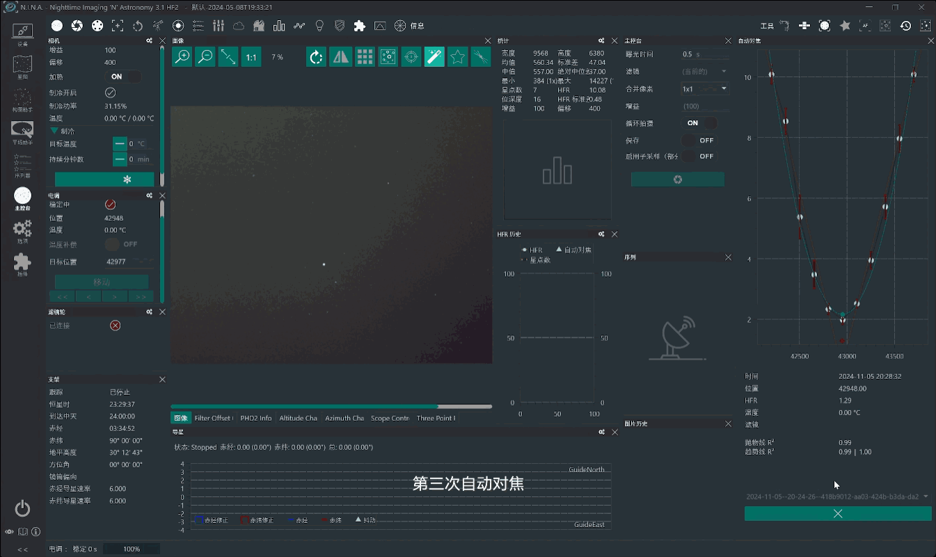 测试过程采用同一套设备,并在相同的环境条件下进行。通过使用 N.I.N.A 软件和天文智能控制器,连续进行三次自动对焦,比对对焦结果和对焦曲线,检验电调焦的对焦效果以及天文智能控制器对焦算法的稳定性。