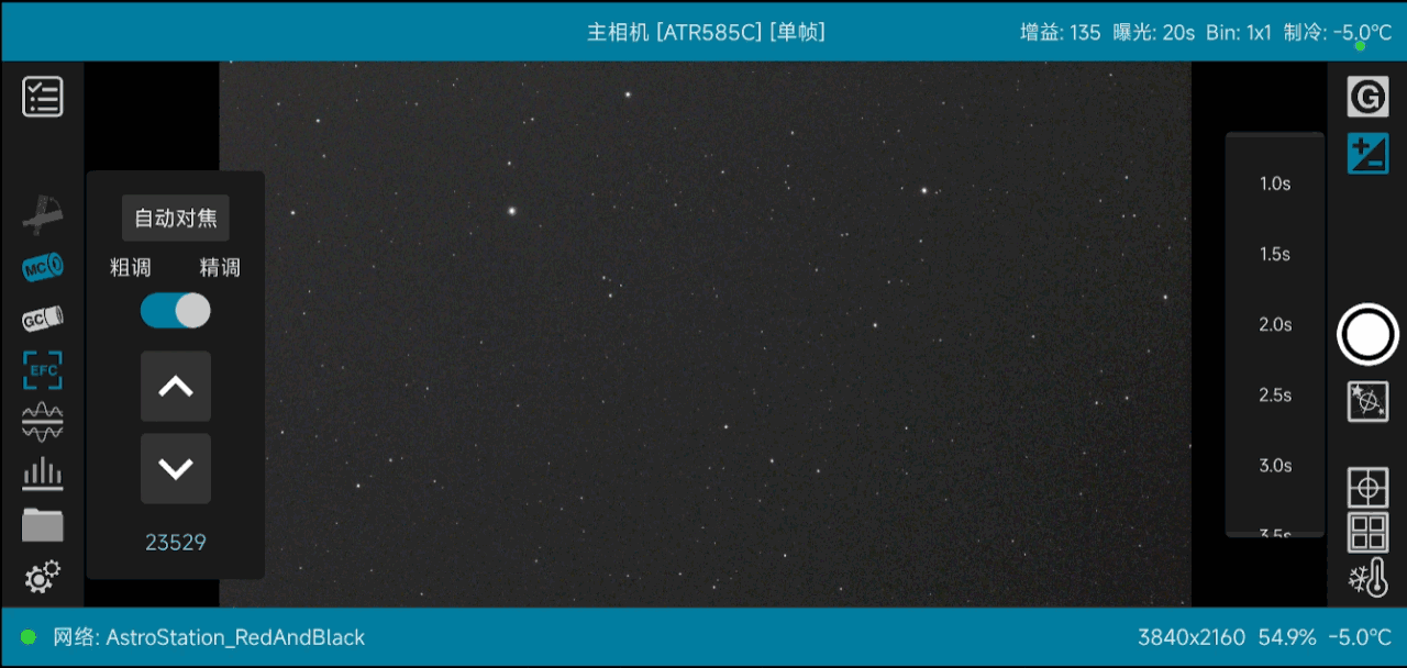 退出自动对焦,盖上鱼骨板,调整单帧曝光时间为20s,检验自动对焦准确性。