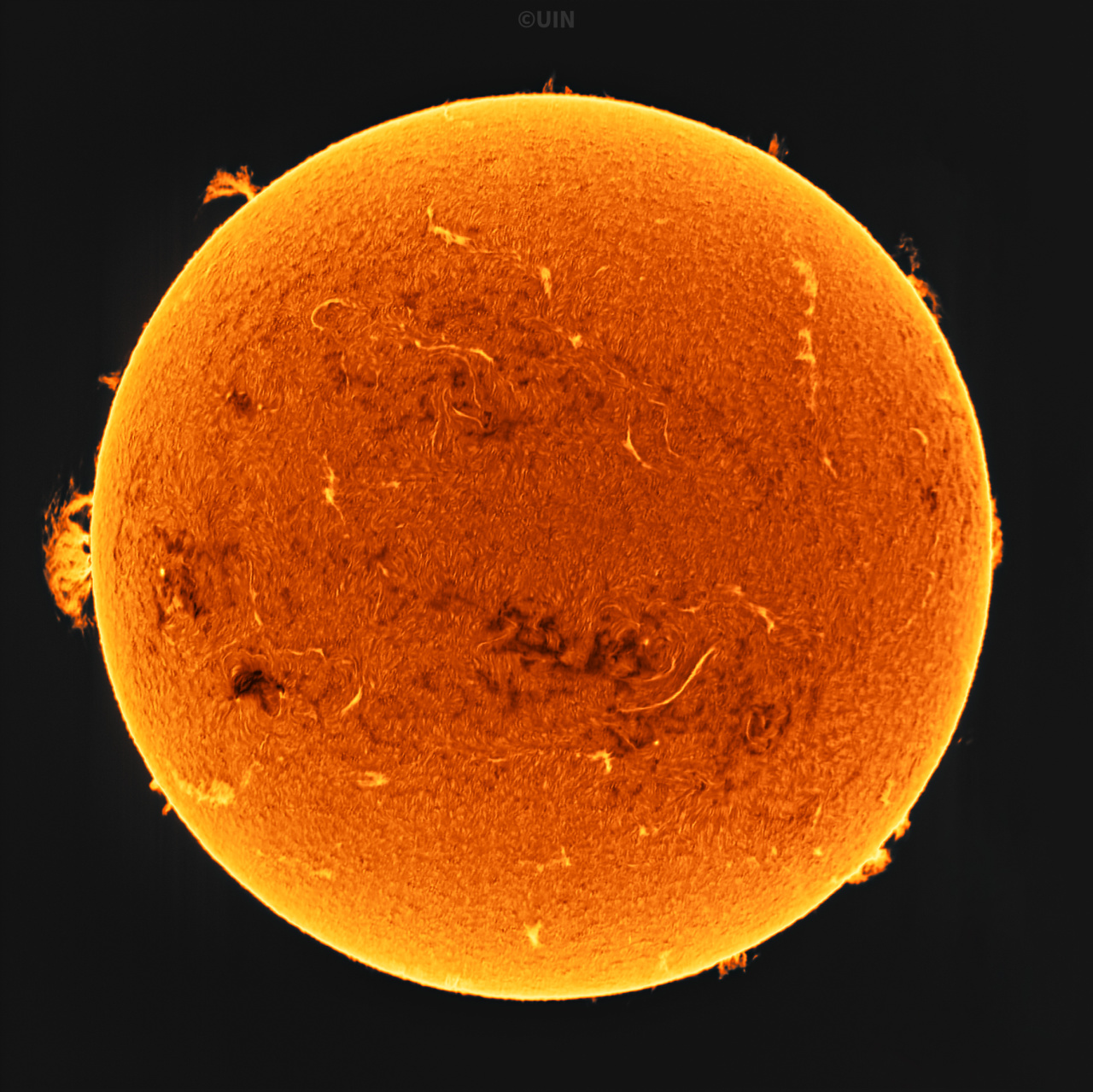 Hα波段对太阳活动具有高度敏感性,一些特定的太阳结构可以通过Hα波段进行观察,如日面边缘出现的明亮结构-日珥,以及日面上的暗结构-暗条。这些结构是冷却的等离子体,它们悬浮在色球层上方,通过观察Hα的辐射,可以清晰地展示太阳活动的详细结构,研究它们的物理性质和演化机制。