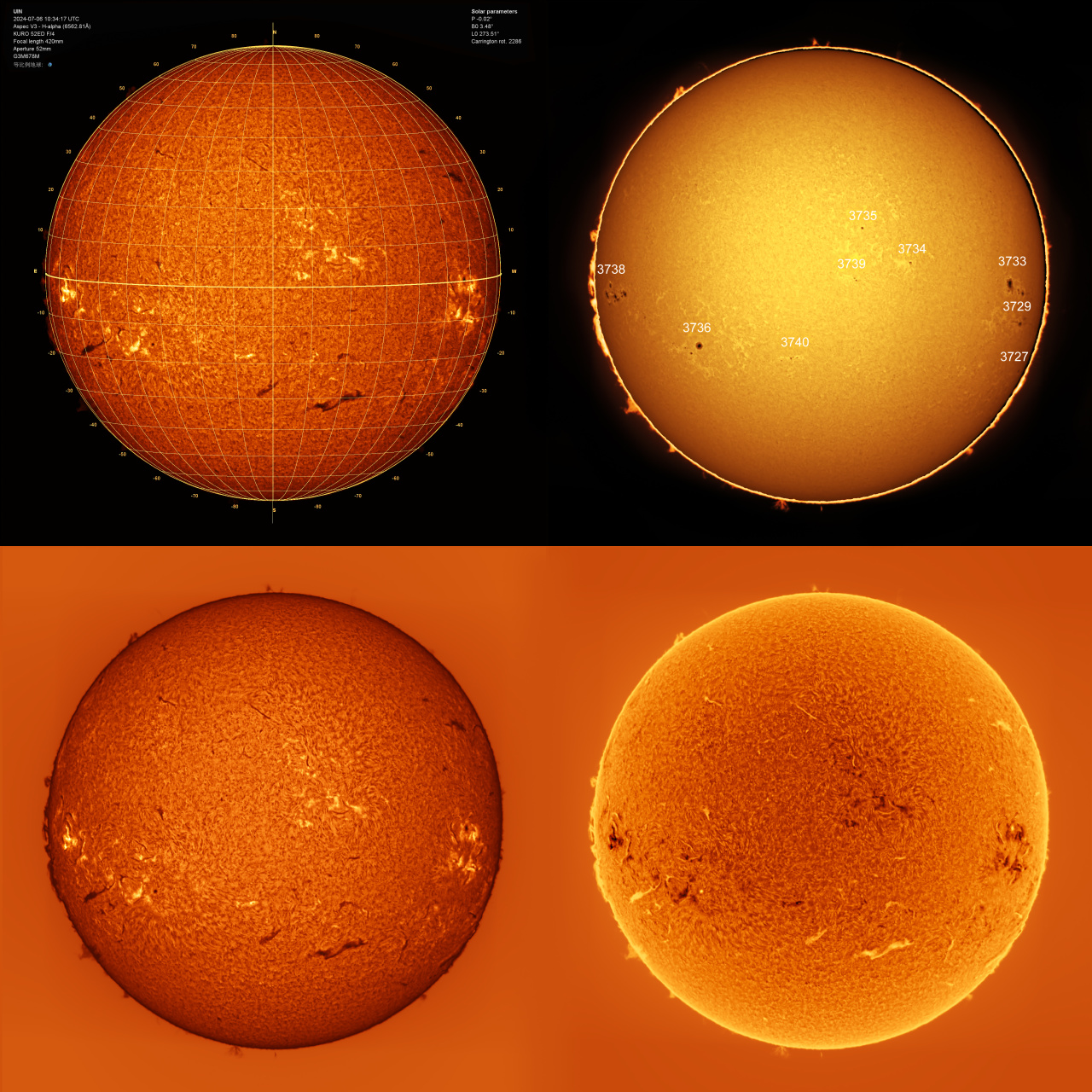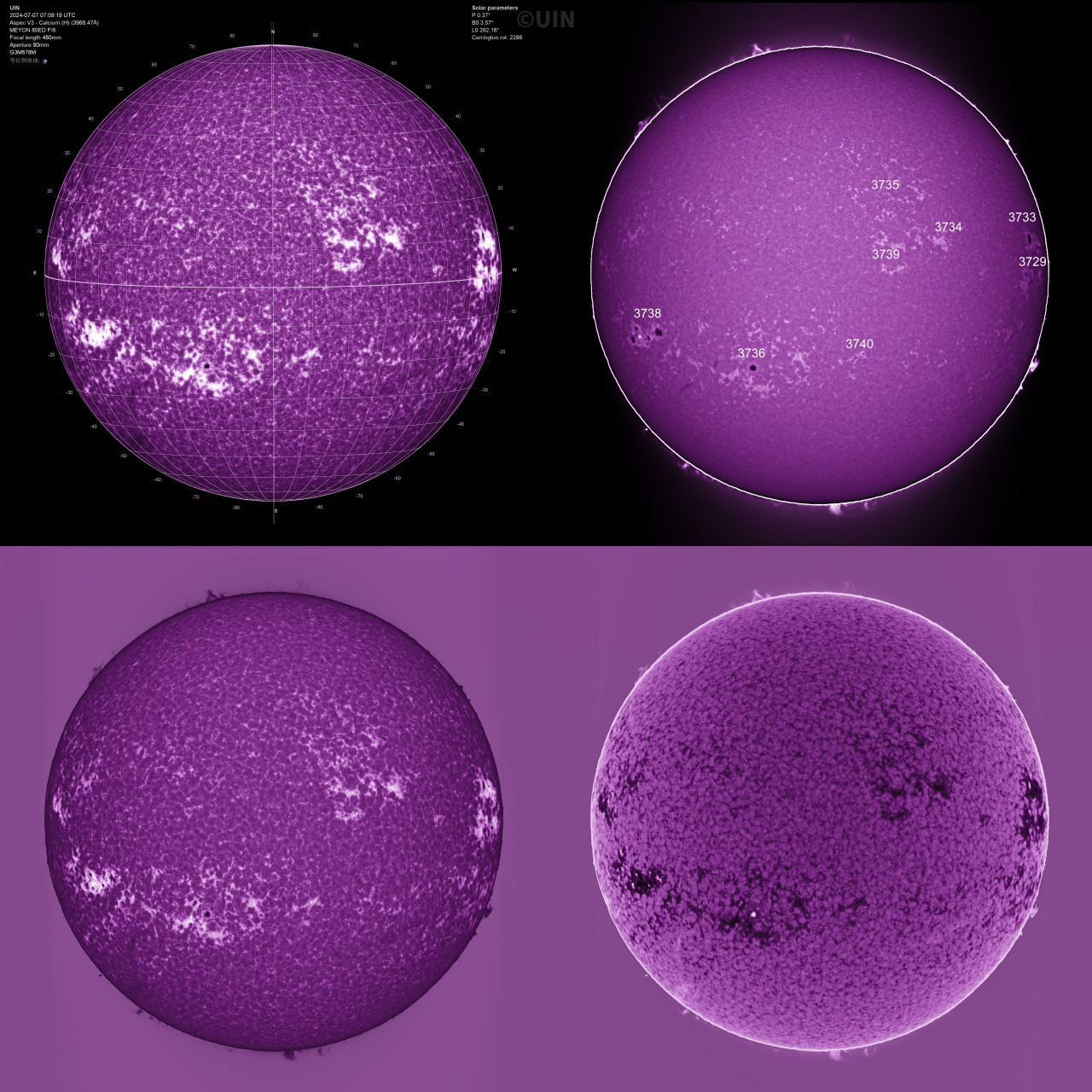 换上 MEYON80ED终于可以拍清楚太阳的CaH谱,这是CaK的伴随跃迁吸收线,位于色球层底部。左上角为单段视频用jsolex生成的科学卡片,右上角是偏移15像素重建的图像+日珥环。