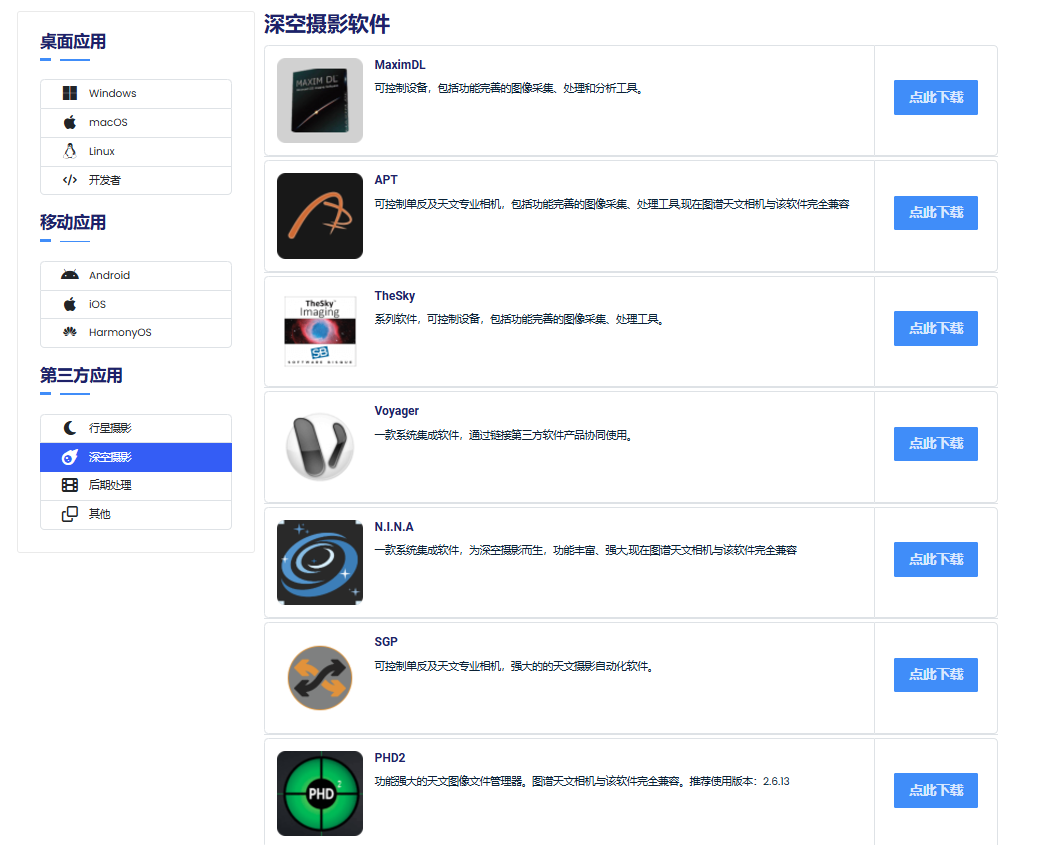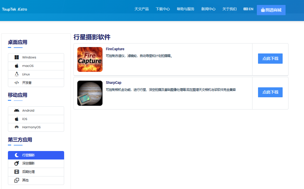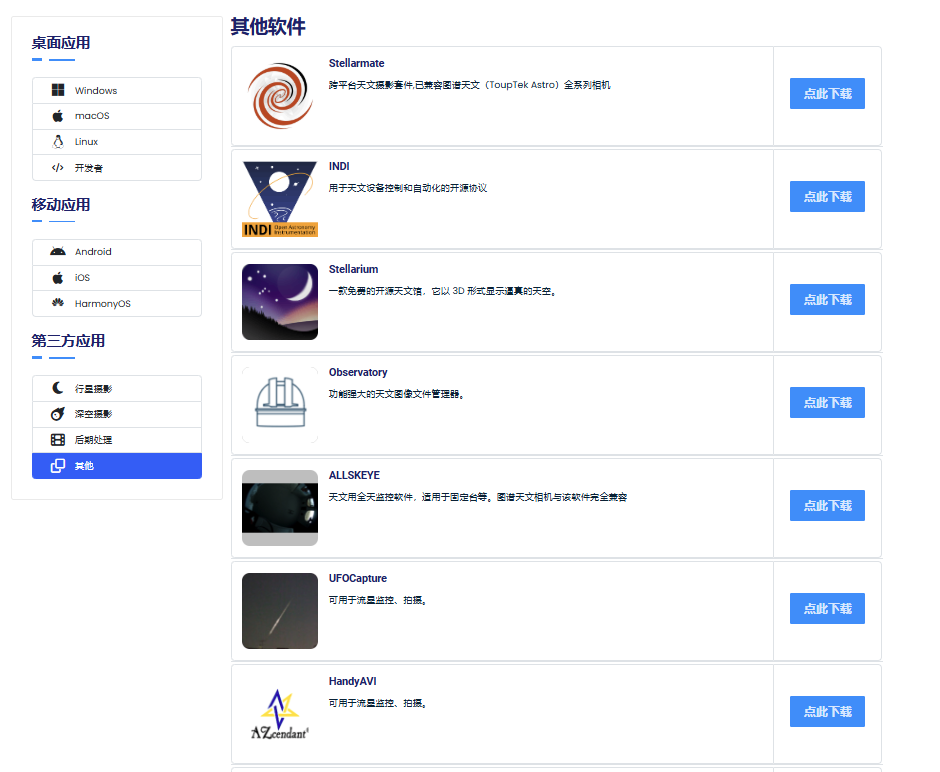 用户可访问图谱天文官方网站[https://www.touptek-astro.com.cn/downloads/?atfWidgetNav=box_win]获取各类软件的下载链接,或下载本地驱动程序后,将其安装至第三方软件中进行使用。
