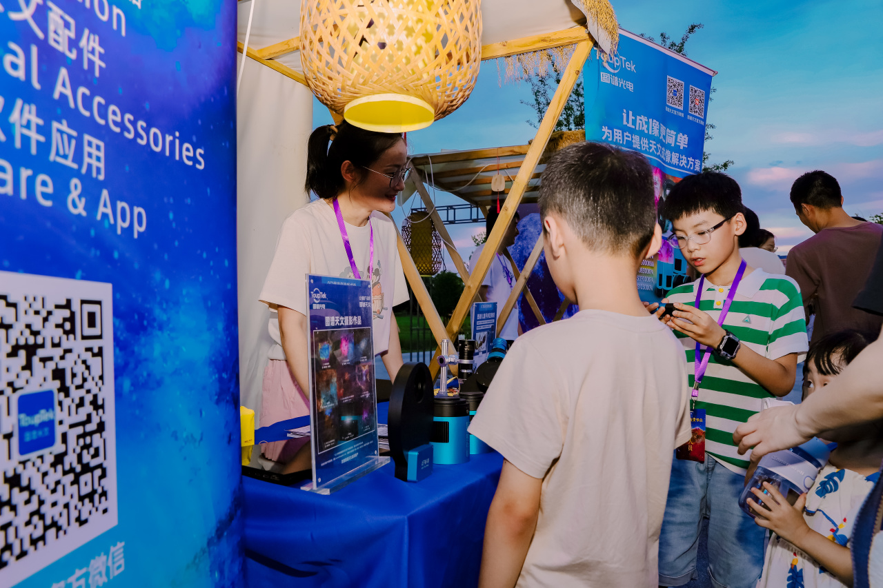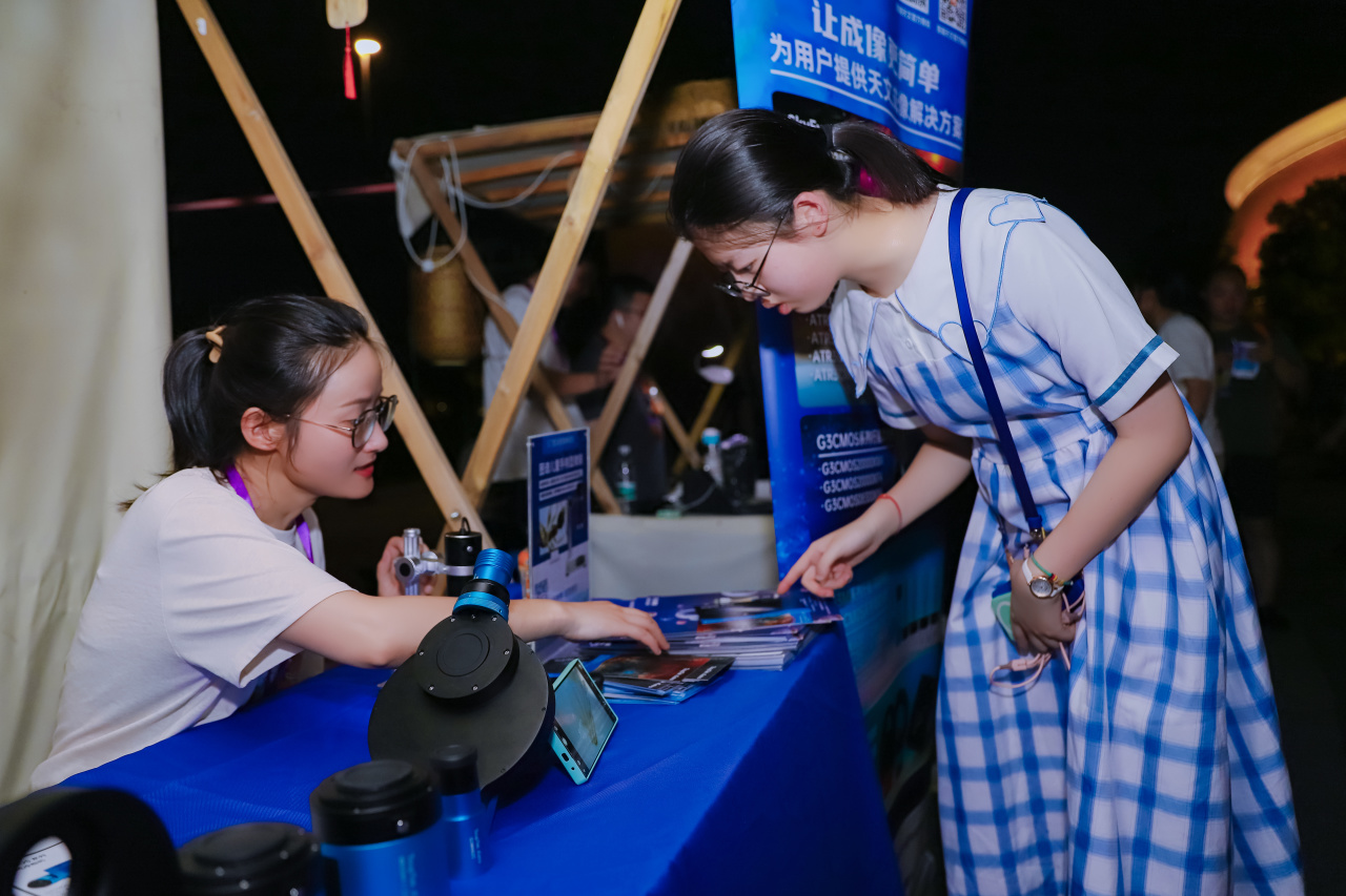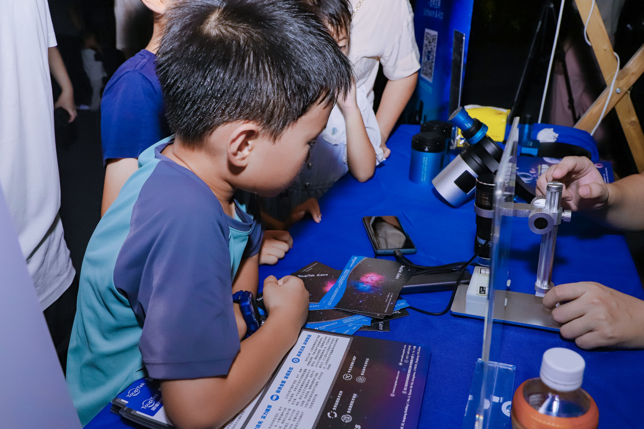 展位前熙熙攘攘,孩子们和大人们的眼中闪烁着好奇与赞叹。他们不仅对用户拍摄的天体作品啧啧称奇,更对那些能够捕捉宇宙壮丽景象的天文相机倾注着好奇。