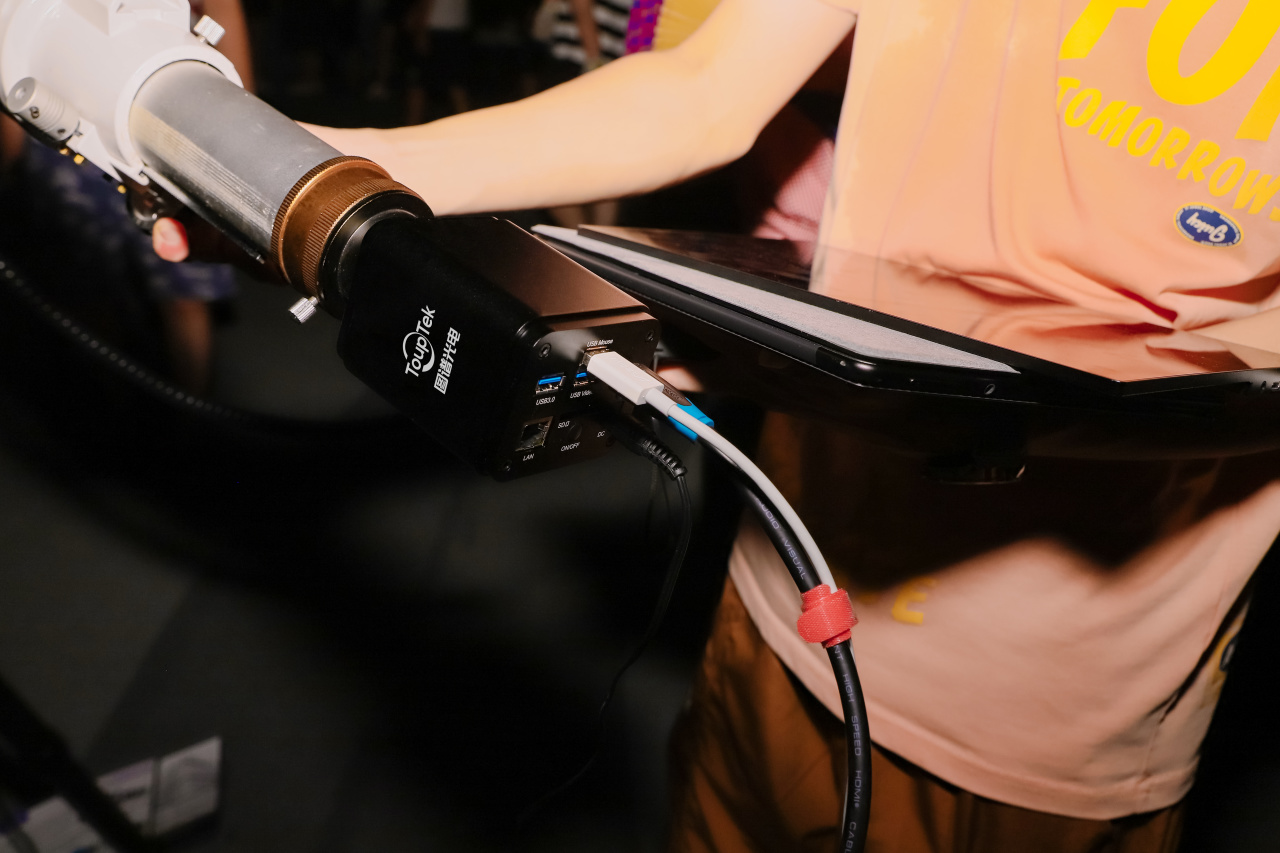 图谱天文技术团队现场展开操作演示,相机安装在望远镜后端,通过USB3.0线缆与内置WIFI连接移动设备,即可在图谱自研的ToupView软件实时观看到望远镜中的画面。天体观测就是如此简单、直接。